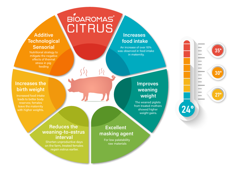 BIOAROMAS Citrus is recognized for increasing food consumption, improving weaning weight, reducing weaning-to-estrus interval, increasing maternity exit weight, and also represents an innovative nutritional strategy to mitigate the negative effects of heat stress on feeding.
